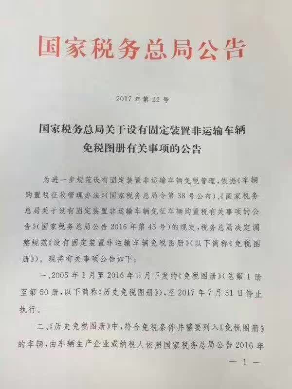 國家稅務(wù)總局關(guān)于設(shè)有固定裝置非運(yùn)輸車輛免稅圖冊有關(guān)事宜的公告