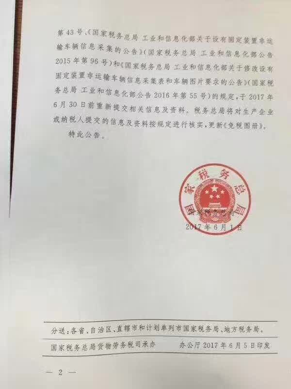 關(guān)于之前一直眾說紛紜的,環(huán)衛(wèi)車將2017年7月1日專用車取消免稅說法,現(xiàn)在國家稅務(wù)總局的正式文件已經(jīng)下發(fā), 已證實(shí), 并不是取消專用車免稅政策, 只是從7月1日起更換免稅圖冊, 新的免稅圖冊沒有下來之前不能辦理免稅 ,所以請需要購新車的客戶提前訂車, 避免造車麻煩 ,環(huán)衛(wèi)車購置稅免征情況說明1、《歷史免稅圖冊》(2005年1月-2016年5月下發(fā)的《免稅圖冊》)將于2017年7月31日停止執(zhí)行。2、《歷史免稅圖冊》中的免征車型由車輛生產(chǎn)企業(yè)于2017年6月30日前重新提交相關(guān)信息與資料進(jìn)行審核,更新《免稅圖冊》。原文如下: